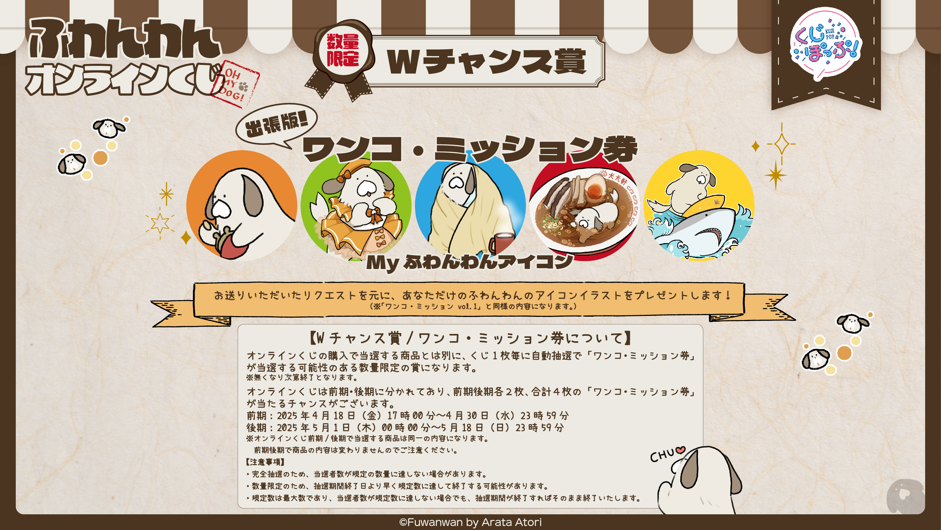 現在このくじは販売していませんふわふわブランケット全1種類当選確率5/100サイズ:約W1,450×H1,000mm組み立てアクリルスタンド全4種類当選確率15/100サイズ(組み立て後):約W85×H70mm以内 ※絵柄によってサイズが異なります。 (ランダム当選となります)A-1 組み立てアクリルスタンド ゆらゆらアクスタ(成犬)A-2 組み立てアクリルスタンド ゆらゆらアクスタ(パピー)A-3 組み立てアクリルスタンド アクリルヌードルストッパー(ムキムキ煙犬)A-4 組み立てアクリルスタンド アクリルヌードルストッパー(おけつホカホカ)アクリルスタンド全10種類当選確率33/100サイズ:約W58×H73mm以内 ※絵柄によってサイズが異なります。 (ランダム当選となります)B-1 アクリルスタンド ホットドックB-2 アクリルスタンド ラーメン泳ぎ犬B-3 アクリルスタンド 動かざることイヌのごとしB-4 アクリルスタンド さいきん肩と腰いたいワン~B-5 アクリルスタンド ここにペットシーツしくワンB-6 アクリルスタンド わんちゃんなので帰っていいでしょうか!B-7 アクリルスタンド 成犬&パピーB-8 アクリルスタンド アイドルB-9 アクリルスタンド うそでしょ…B-10 アクリルスタンド Dog Kissミニ缶バッジセット全10種類当選確率47/100サイズ:φ38mm以内 ※2種セットになります。 (ランダム当選となります)C-1 ミニ缶バッジセット ①C-2 ミニ缶バッジセット ②C-3 ミニ缶バッジセット ③C-4 ミニ缶バッジセット ④C-5 ミニ缶バッジセット ⑤C-6 ミニ缶バッジセット ⑥C-7 ミニ缶バッジセット ⑦C-8 ミニ缶バッジセット ⑧C-9 ミニ缶バッジセット ⑨C-10 ミニ缶バッジセット ⑩特典ポストカード全11種類くじ5枚同時購入で「ポストカード」をランダムで1枚プレゼント!! ※累計で5枚以上購入されても対象になりません。 (例:1回目の購入で2枚、2回目の購入で8枚ご購入の場合、特典枚数は1枚のみになります。) ※同時購入であれば5枚ごとに特典が当たります。 (例:10枚同時購入で2枚、20枚で4枚)★5 伝説の聖犬騎士ふわんわん美術館に寄贈された犬名画その♡、マズルに変えてあげワンねぇお手会きてくれてありがとワンマズルのキング犬鹿蝶美術館に寄贈された雑種犬チャイナイヌFuwanwan証明写真暑中お見舞い申し上げワンキャンプイヌワンコ・ミッション券全1種類オンラインくじの購入で当選する商品とは別に、くじ1枚毎に自動抽選で「ワンコ・ミッション券」が当選する可能性のある数量限定の賞になります。 ※無くなり次第終了となります。 ※詳細は下記画像をご確認ください。